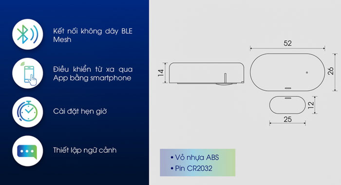 - Bộ cảm biến cửa CB08.DO.BLE có thể kết nối không dây Bluetooth Mesh, cài đặt ứng dụng trên điện thoại, khi phát hiện cửa mở sẽ kích hoạt chuông báo, và gửi thông báo đến điện thoại người dùng.