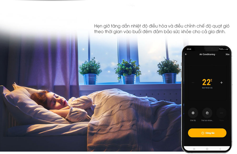 Tự động tăng giảm nhiệt độ điều hòa theo thời gian. Hẹn giờ tăng dần nhiệt độ điều hòa và điều chỉnh chế độ quạt gió theo thời gian vào buổi đêm đảm bảo sức khỏe cho cả gia đình.