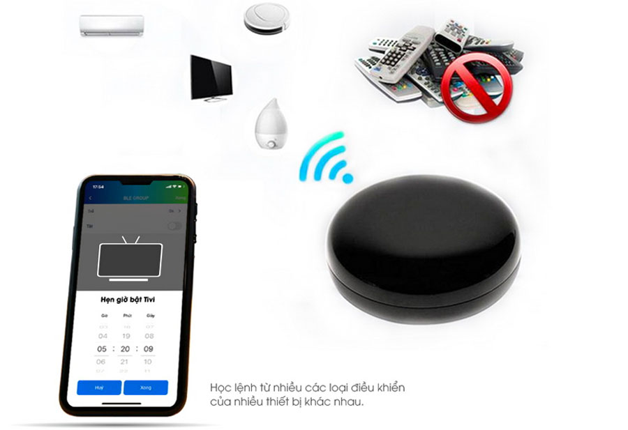 Chỉ cần 1 chiếc smartphone thay vì 10 remote cầm tay tương ứng điều khiển 10 thiết bị khác nhau, điều khiển từ xa đa năng thông minh ĐK01.IR.WF: