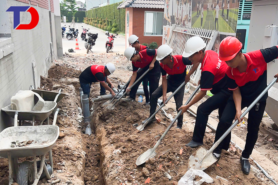 Các kỹ sư Tâm Đức Tech thi công hệ thống cấp thoát nước